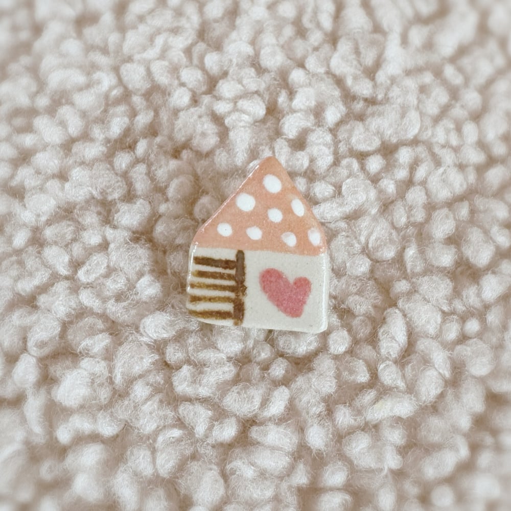 Broche façonnée à la main Réalisées avec du grès blanc Décor pois orange et brun Cuisson à haute température Taille mini