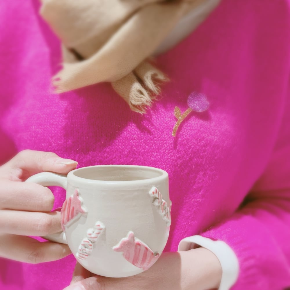 Mug façonnée à la main Réalisée avec du grès blanc Décor candy rose et mot JOY Cuisson à haute température Passe au lave-vaisselle